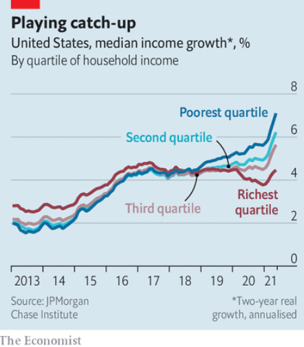 The rate of growth in median income for the poorest quartile in the US is now just on twice that of the the rate experienced by the richest. Back in 2017 the numbers were similar across the divide, while in 2013 growth rates favoured the rich. As ever seems to be the case the melodramatic is trumped by observed data. For those in the poorest quartile that is good news just as it may be bad news for the attention seekers in so many media.